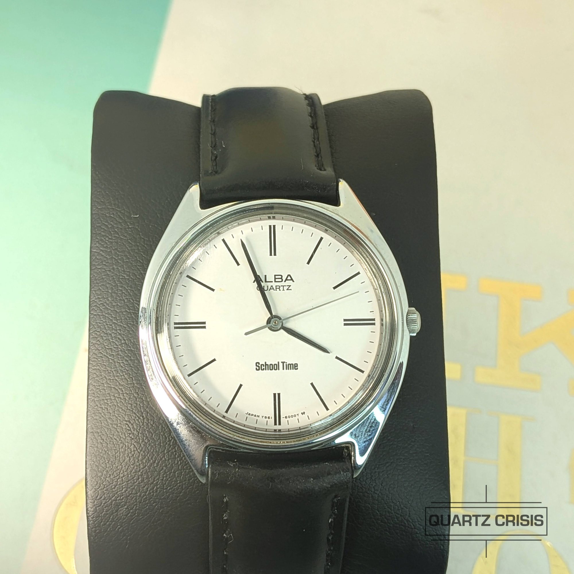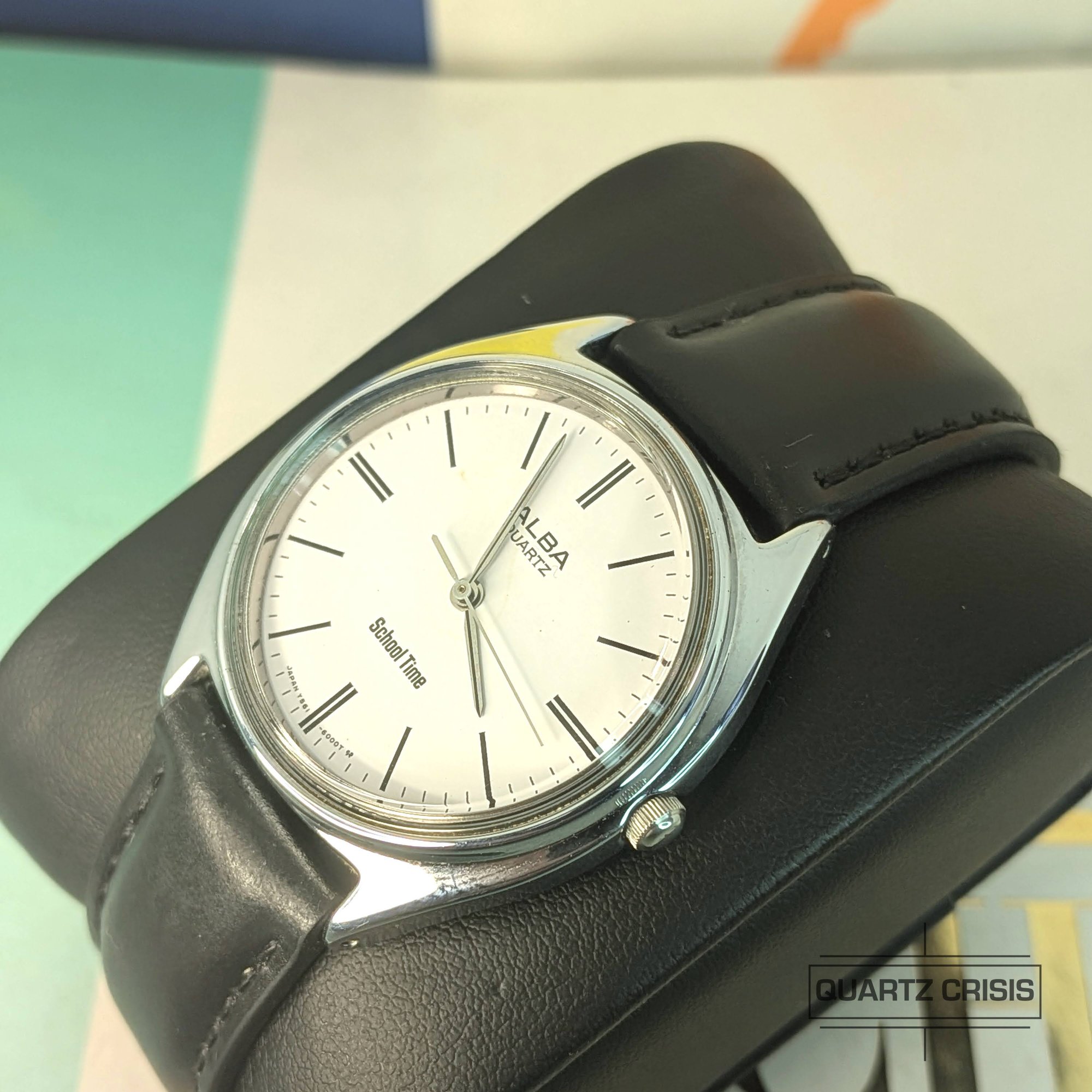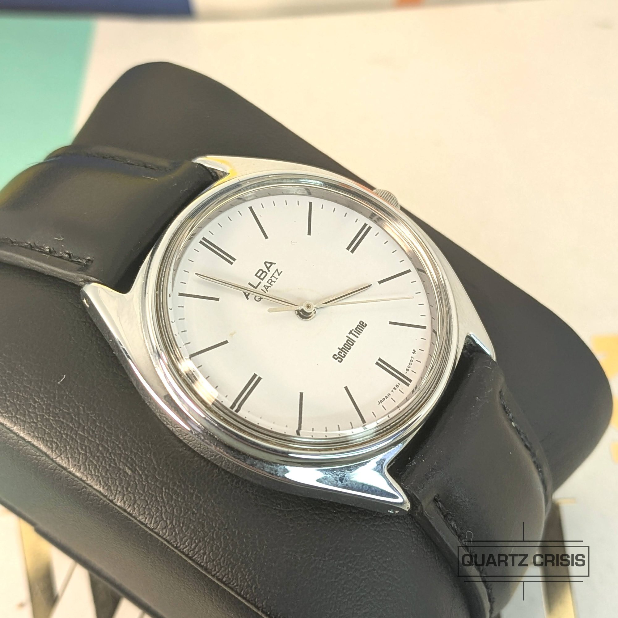 Cute little quartz collectable from Seiko sub brand Alba. The School Time line was a Japanese exclusive that focused on making simple good quality watches for school children, and this particular model from 1980 was early in the transition from mechanical to quartz. It features a steel case, acrylic crystal, matte white dial with painted Alba/School Time insignia and a simple time-only movement.