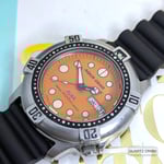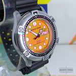 Cool, weird and wearable quartz diver from JDM Seiko sub-brand Alba that draws from Seiko's dive watch heritage while looking very late-80s. Features a distinctive mid-size case, steel notched bezel and a striking orange dial. Inside it's powered by a Seiko V346 quartz movement and features a bilingual day-date calendar.