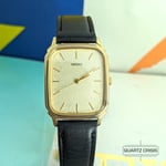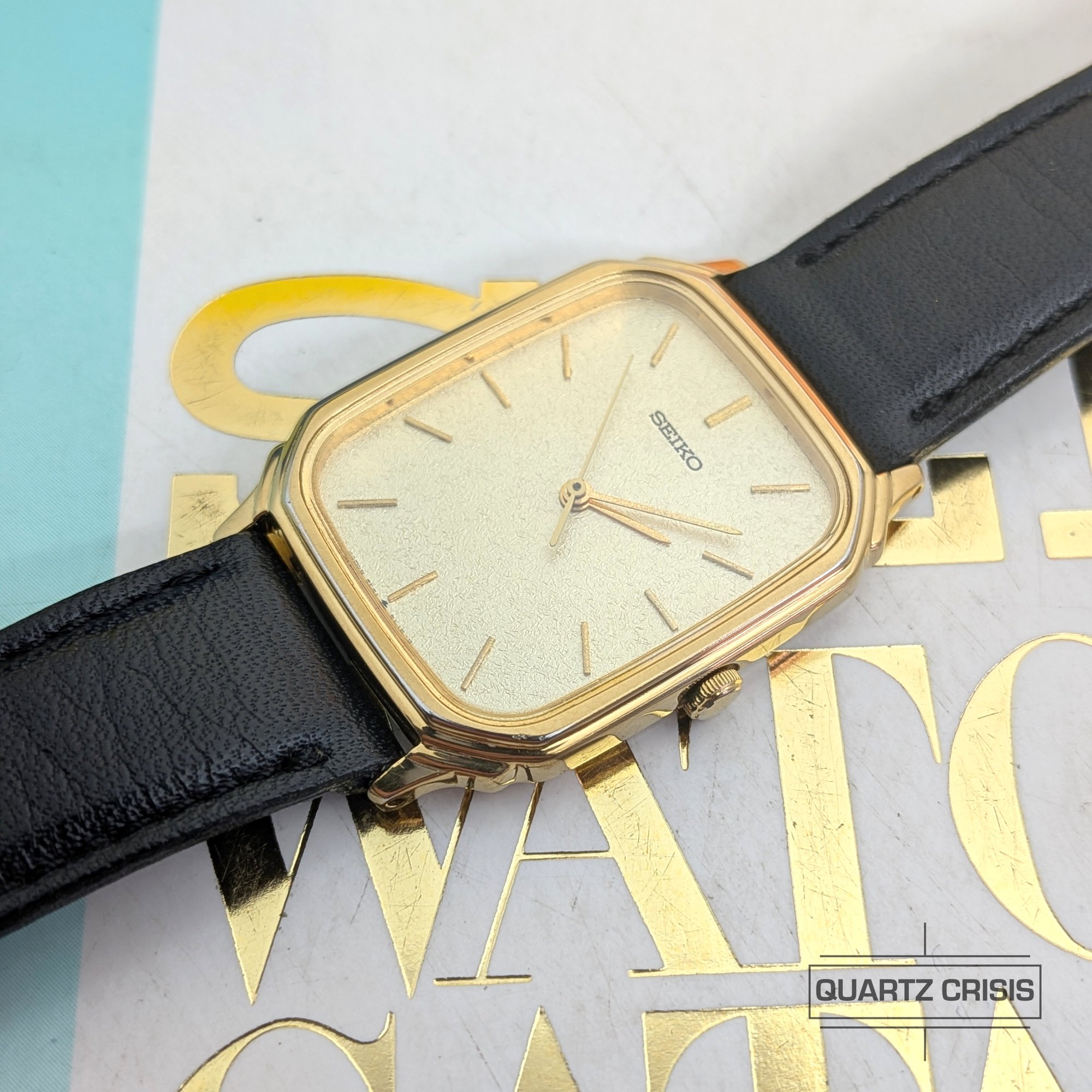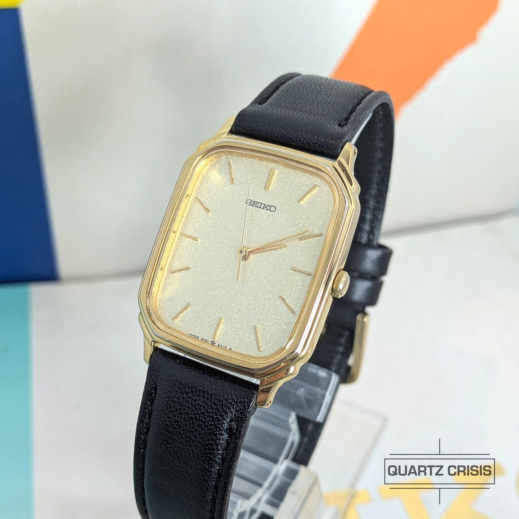 Nice late 80s era unisex dress piece from Seiko with a faceted art deco style tank case and gold snowflake textured dial. Very clean design with gold baton indices and simple Seiko insignia.