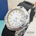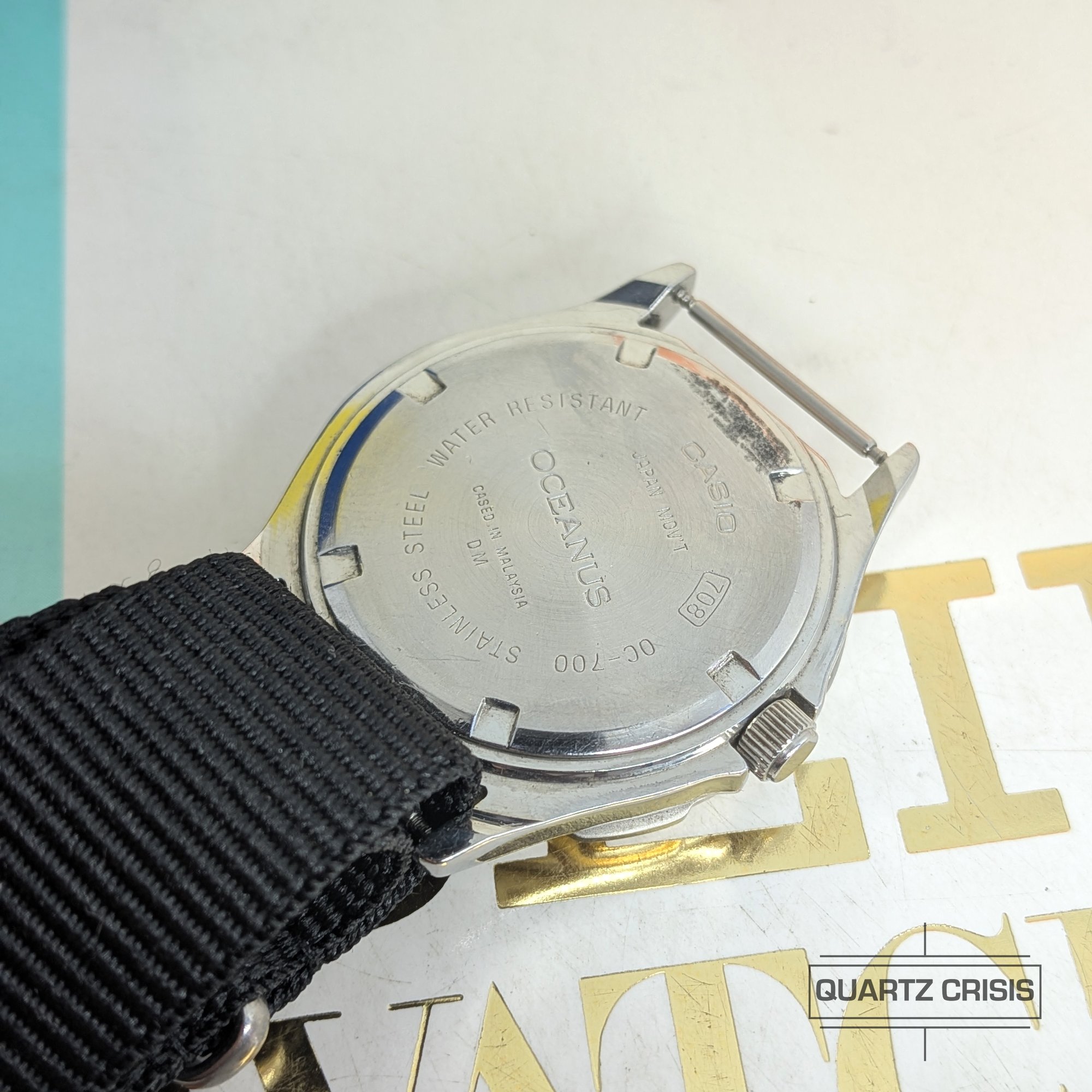 Much like their Edifice series, Casio's Japan-only Oceanus line presents slightly more upmarket pieces than their standard fare, made with higher-quality materials and specifications. This particular late-1990s OC-700 diver presents a super-simple time and date only quartz movement within a robust steel dive case and classy off-white dial.