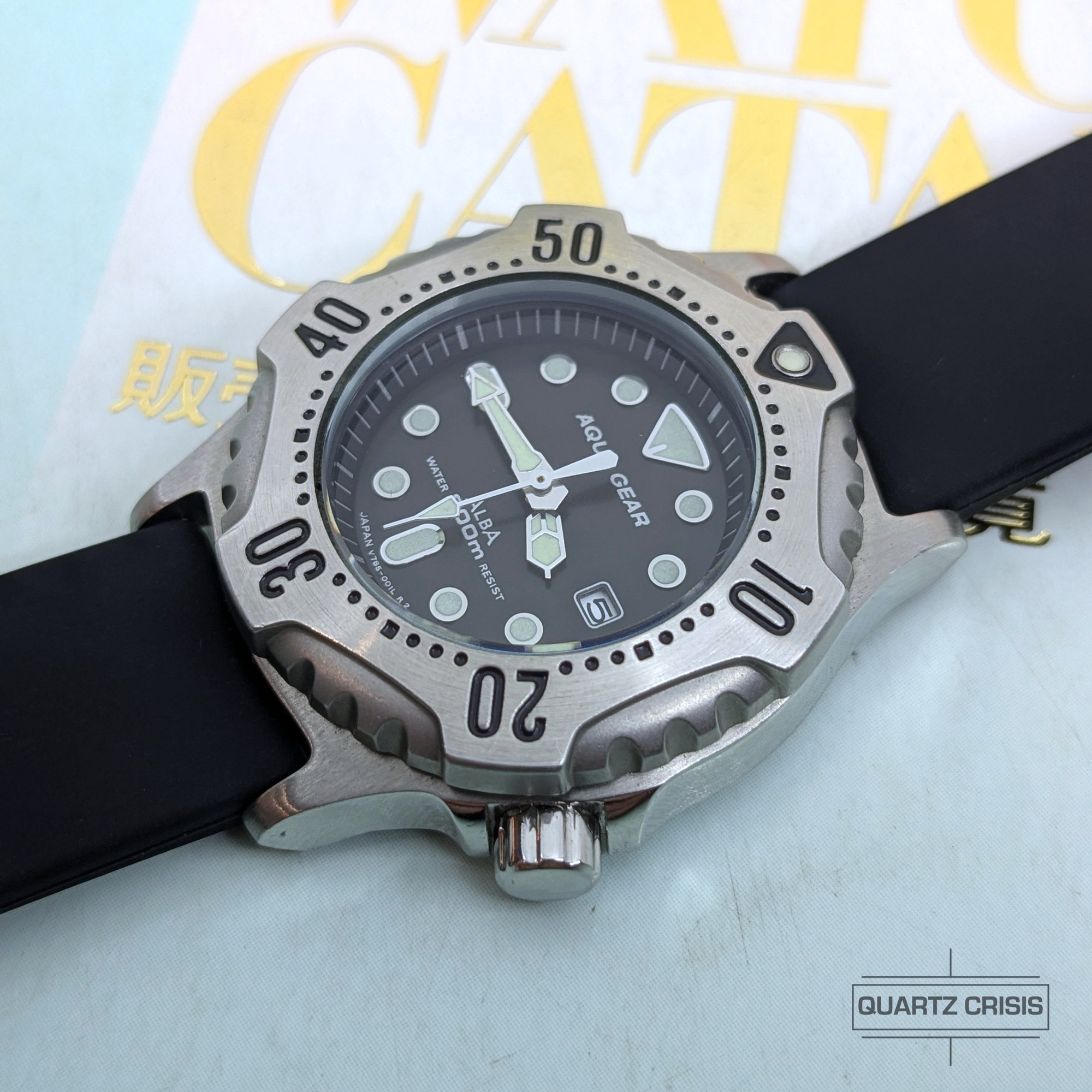Alba's Aqua Gear series presented serious Seiko dive watch heritage in a budget package that could often take some design risks not seen on the more classic upmarket models. This petite model features a striking polished steel dive bezel and contrasting black/grey dial with Alba/Aqua Gear insignia..