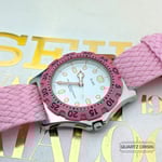 Seiko's dive watches made under the Alba sub-brand presented proper Seiko diver heritage in a budget package that could often take some design risks not seen on the classic models. This mid-size model has a very 90s steel case/acrylic bezel design and features a striking pink and white colour scheme.