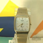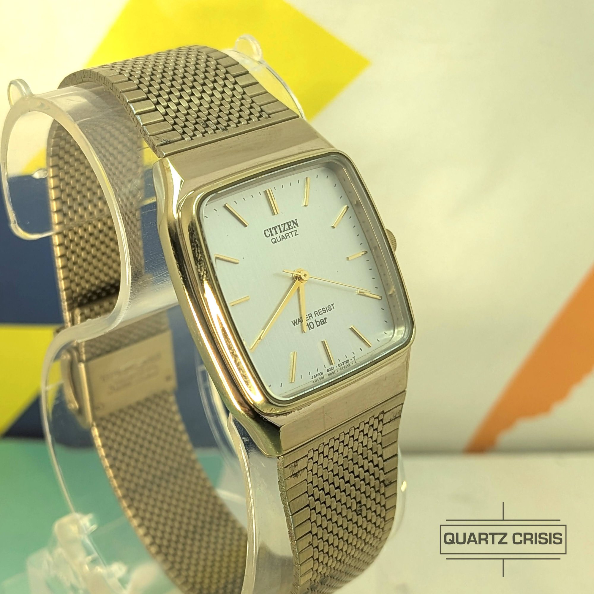 Super nice gold plated piece from Citizen from the early 90s. This one features a rectangular 'tank' style case with integrated adjustable bracelet. Inside you'll find a lovely satin dial with gold handset, applied baton indices and painted Citizen Quartz insignia.