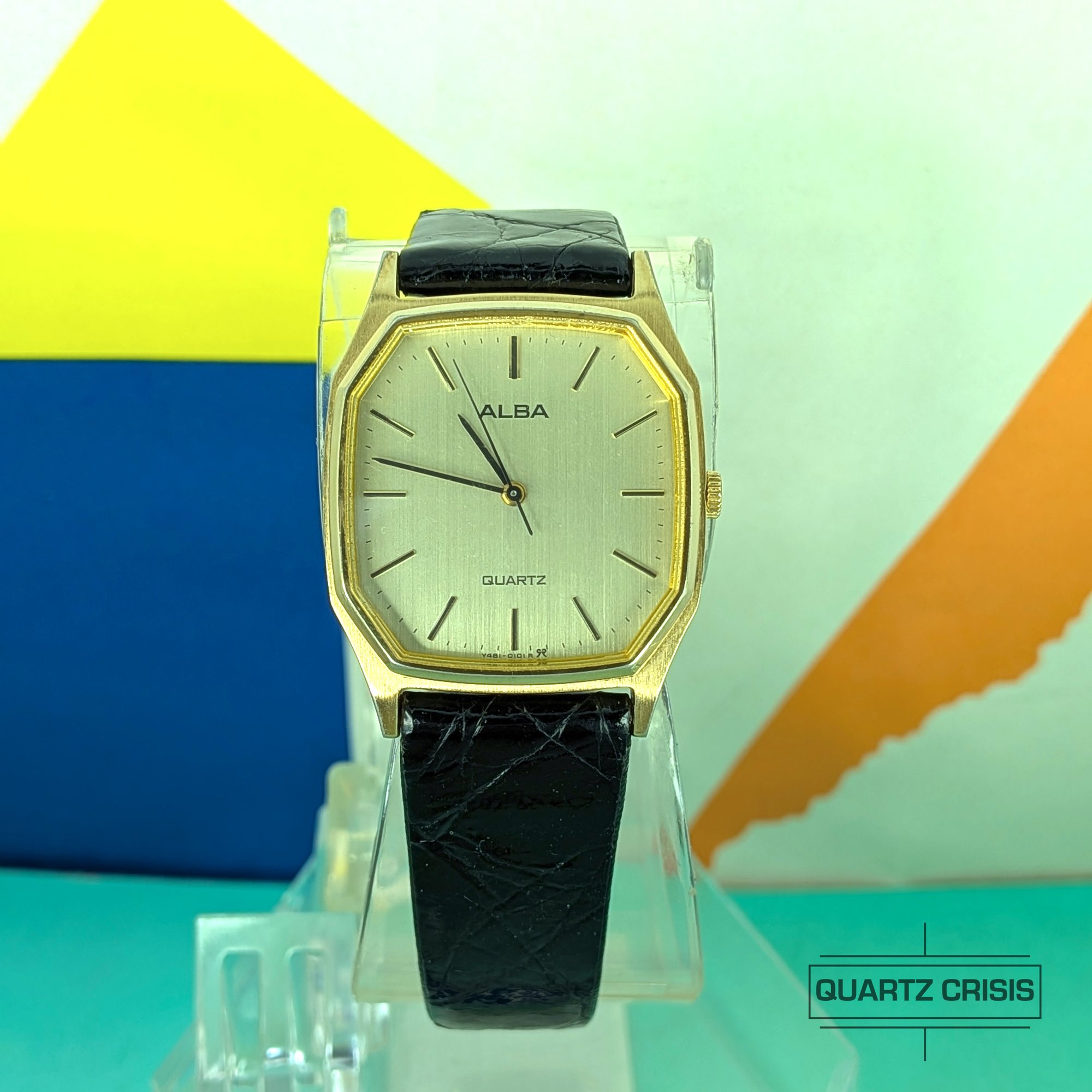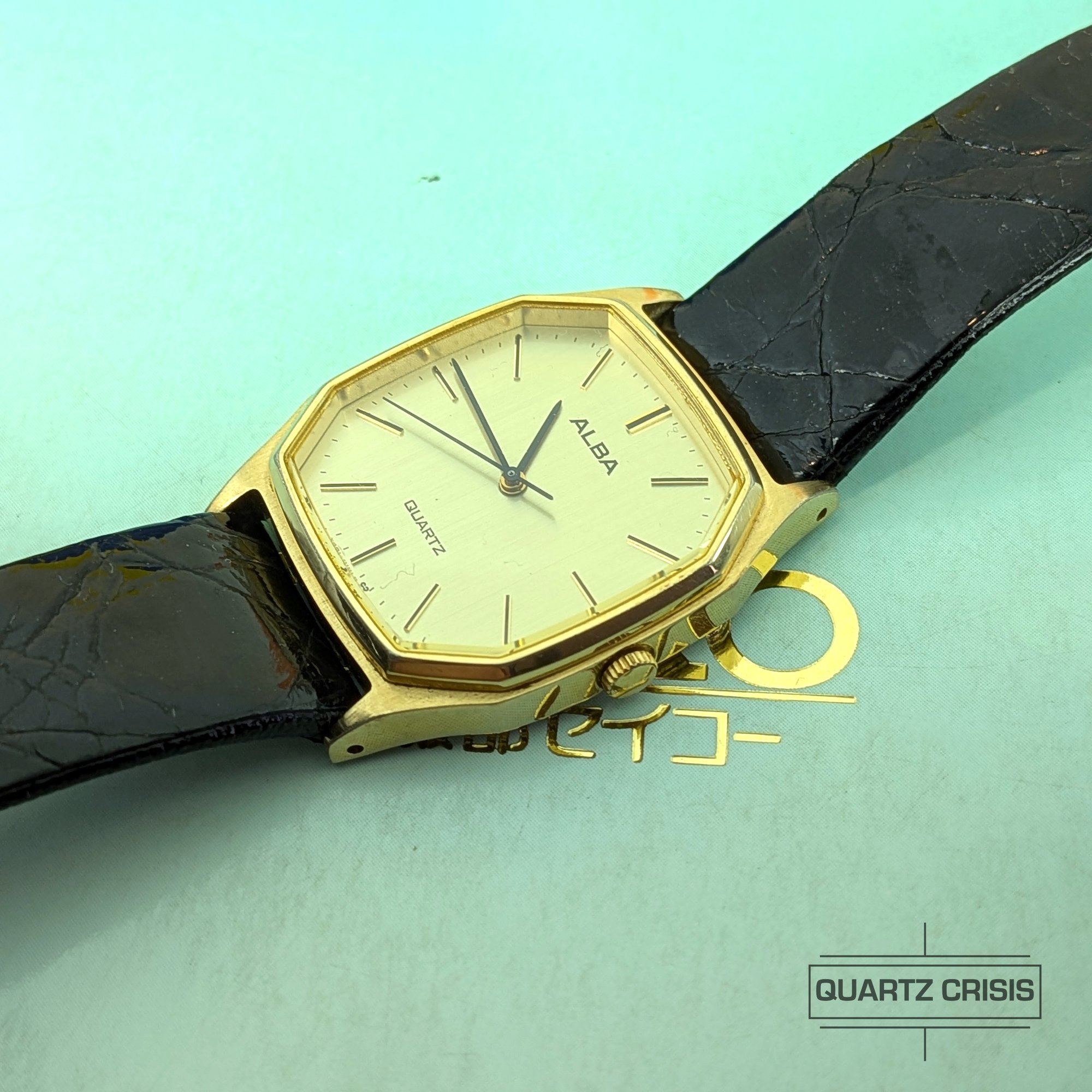 Nice late-90s era dress piece from Seiko sub-brand Alba. This one features a faceted art deco 'tank' style case in a gold plated finish. Inside you'll find a lovely satin finish gold dial with baton indices.