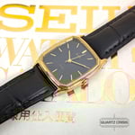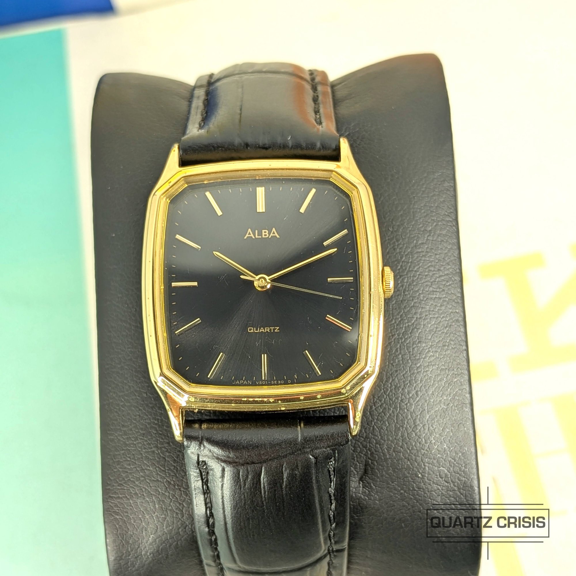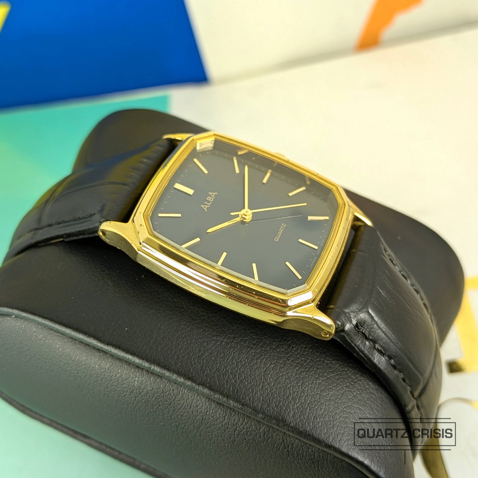 Nice mid-90s era dress piece from Seiko sub-brand Alba. This one features a faceted art deco 'tank' style case in a gold plated finish. Inside you'll find a lovely satin black dial with gold baton indices.
