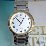 Nice and simple 90s era sporty dress watch. Clean design with gold bezel, metallic grey/white dial, black and steel handset and arabic numerals.