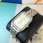 Simple and elegant Y2K era quartz tank with a two-tone steel/gold colour scheme. Inside the faceted case we find a lightly textured dial with striking gold indices and handset and a simple date complication.