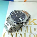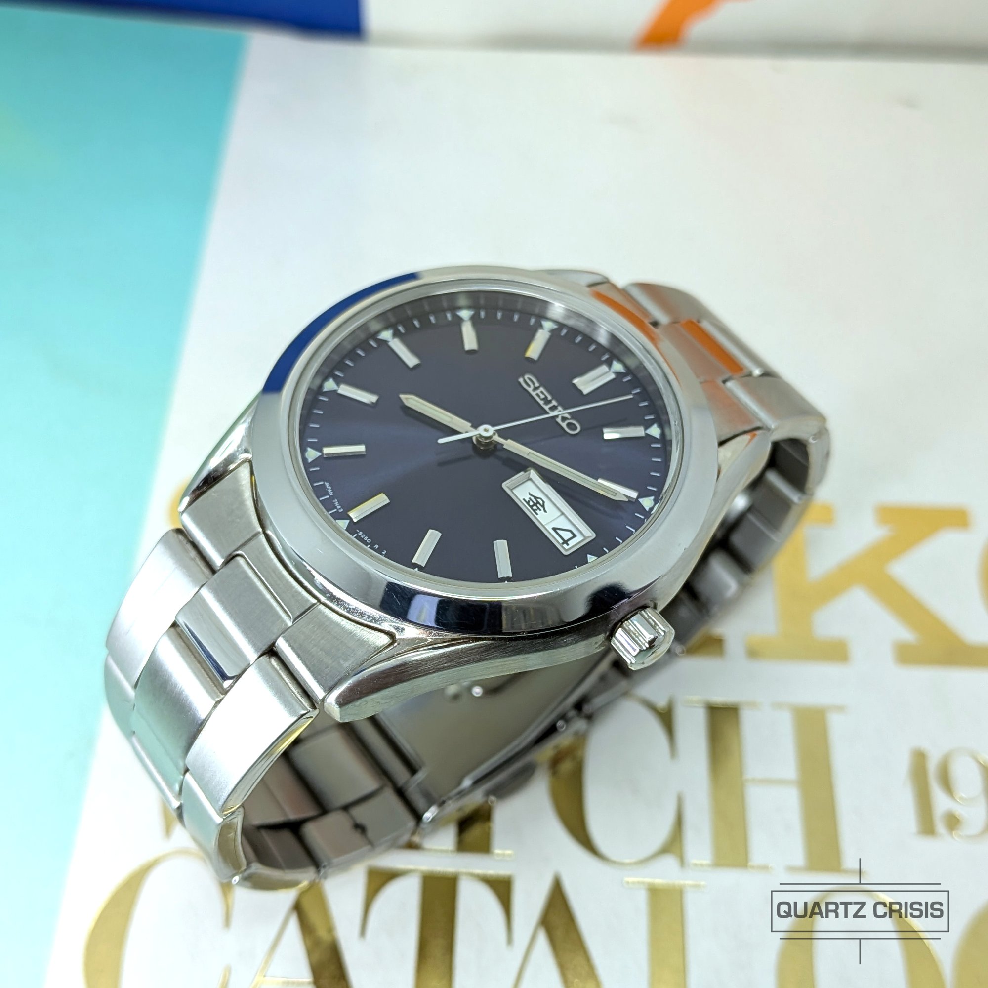 Clean and stylish Y2k era quartz piece from Seiko. This one features a simple faceted steel case with high polish bezel. Inside is a stylish blue satin dial with applied Seiko logo, steel baton indices and handset, and a bilingual kanji-english calendar.