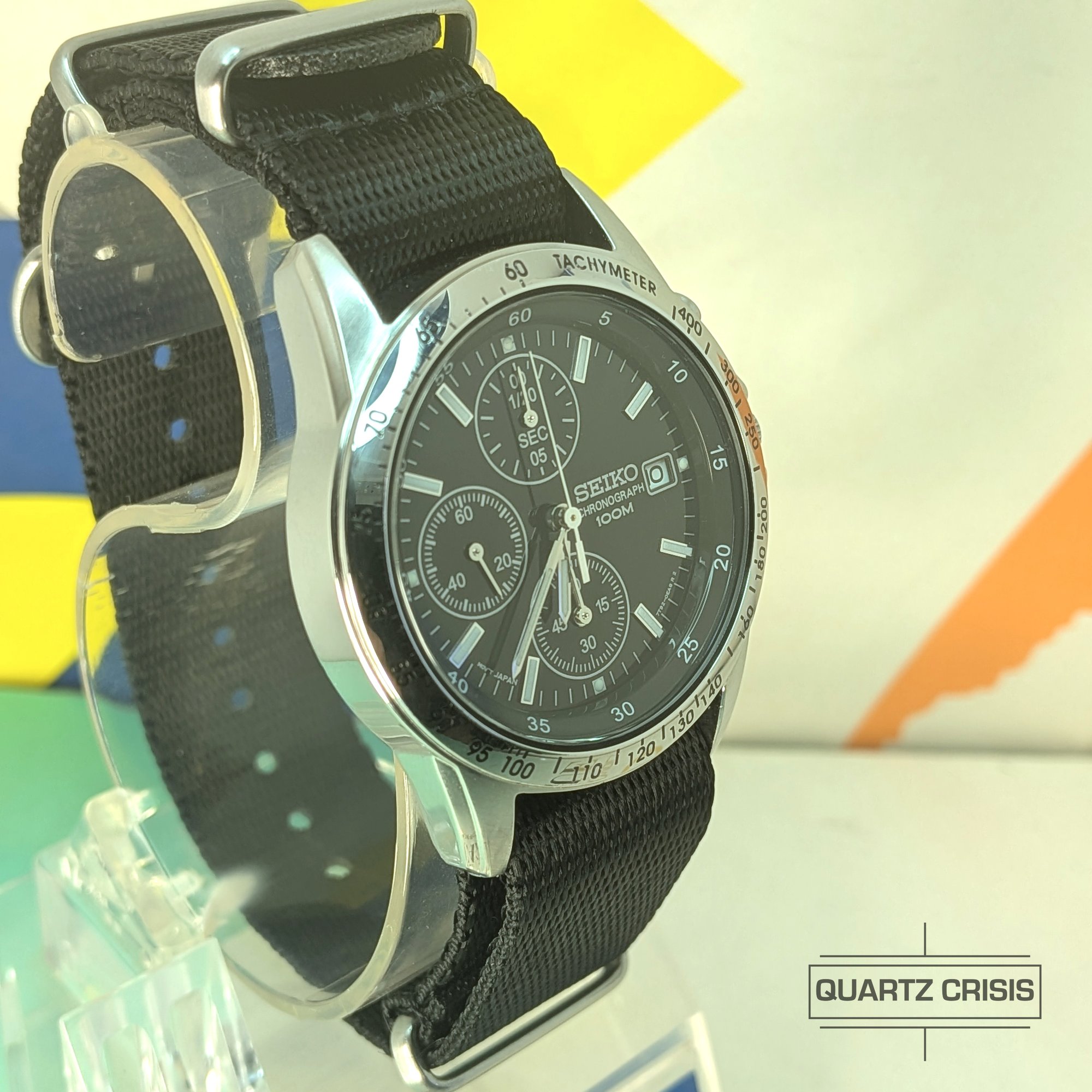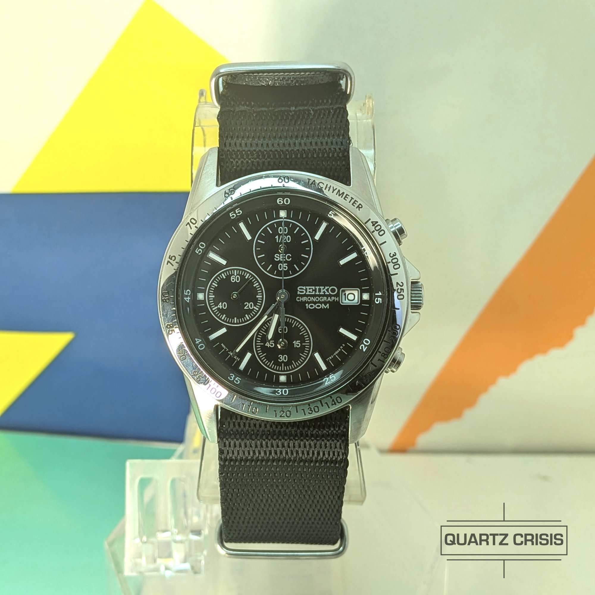 Nice simple modern chrono that recalls both vintage Seiko and classic Swiss chrono designs. Features a steel case with etched tachymeter bezel and a black dial with a classic 3 subdial layout. All powered by the solid 7T92 quartz chrono movement.