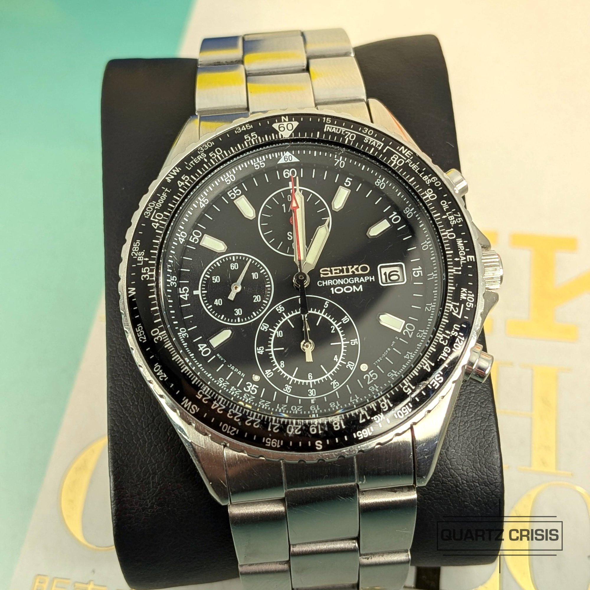 Modern classic pilot's chronograph watch. The clean and clear design language makes it a pleasure to wear and surprisingly compact on the wrist. Seiko made the first quartz chronograph and their mastery of the form is very much evident here. All chrono functions are powered by the modern quartz 7t92 movement.